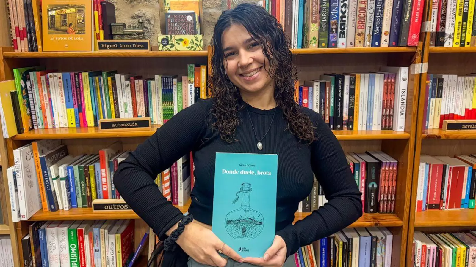 Para la carballiñesa Tania Godoy, el aburrimiento es la semilla de la creatividad. De ahí que fuera en clase, con apenas quince años, cuando empezó a acercarse a la poesía como respuesta al aburrimiento. Aquellos versos tempranos los trasladaría más tarde a su propia voz al entrar en contacto con el slam de poesía, un formato que conectó esta nueva inquietud con su pasión de siempre: el teatro. De esas letras surgieron otras y, a fuerza de improvisar, nació “Donde duele, brota”, su primer poemario publicado, que ha presentado este sábado en la librería Escolma, en O Carballiño.