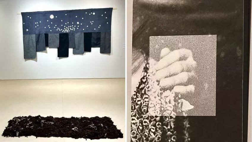 Divide la muestra desde la entrada en dos zonas complementarias, a la izquierda -sinistra manu-, ámbito de lo oscuro, del que penden retales de telas de mandil en la que aplica lejía purificadora, que las decolora, al igual que en las rectangulares a modo de díptico, entre las que intercala palabras, que son nombres femeninos -Angustias, Martirio, Dolores, Soledad, Amparo, Olvido, Socorro-, mujeres significadas en la amplia y crudelísima postguerra tras 1939, en sus tierras del E, últimas en ser ocupadas por las fuerzas militares del ejército de Franco contra el gobierno de la República, tras el frustrado golpe militar en 1936. En uno de los extremos, cuelga un vestido talar negro, color usual para el duelo ante la muerte, con varias capas. Es el tiempo de lo nocturno de “Longa noite de pedra” del poeta Ferreiro Míguez en definitorio verso, la parte por el todo, que es Galicia, tierra sin episodios bélicos aunque con represión desde 1936, canon.