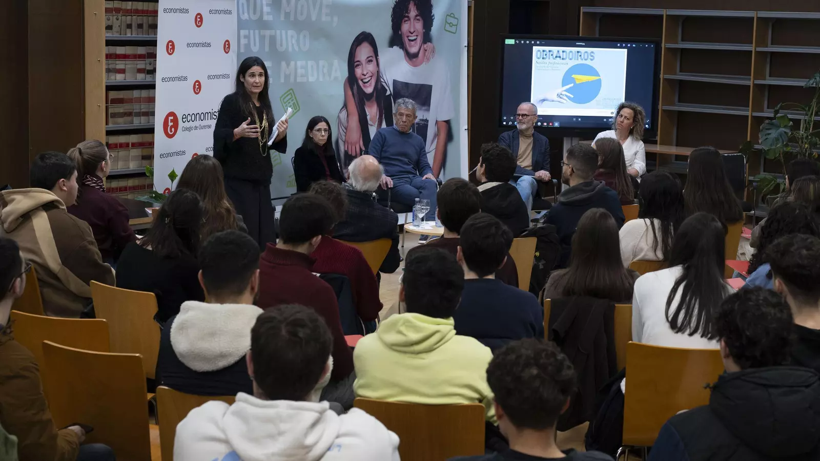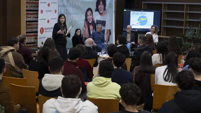 Mientras, la segunda charla acercó al alumnado diferentes opciones en el ámbito privado de la mano de profesionales de la banca (Carlos Díez), la auditoría (Teresa Cuñarro), la dirección comercial (Estela Bermello), la asesoría y gestoría (Carmen Sampayo, presidenta del Colegio de Economistas de Ourense), el control económico (Luis Hermida) y el emprendimiento (Sabela Vila).