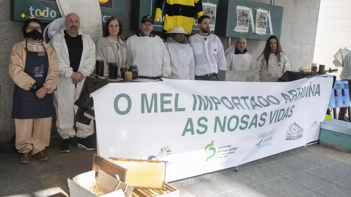Apicultores gallegos se concentraron este martes en Ourense y Lugo para denunciar la entrada de miel importada de bajo precio y origen presuntamente fraudulento, así como el futuro acuerdo comercial entre la Unión Europea y Mercosur, que, aseguran, agravará la crisis del sector.