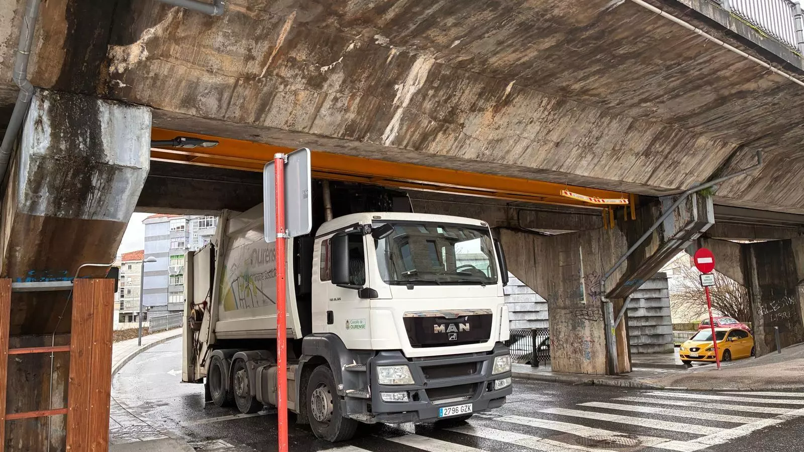 Un "conductor novato" queda atrapado este lunes en el barrio de O Polvorín al calcular de forma incorrecta las dimensiones del camión de la basura del Concello de Ourense. “El camión quedó enganchado arriba contra el puente”, explica Vicente, un vecino de la zona.