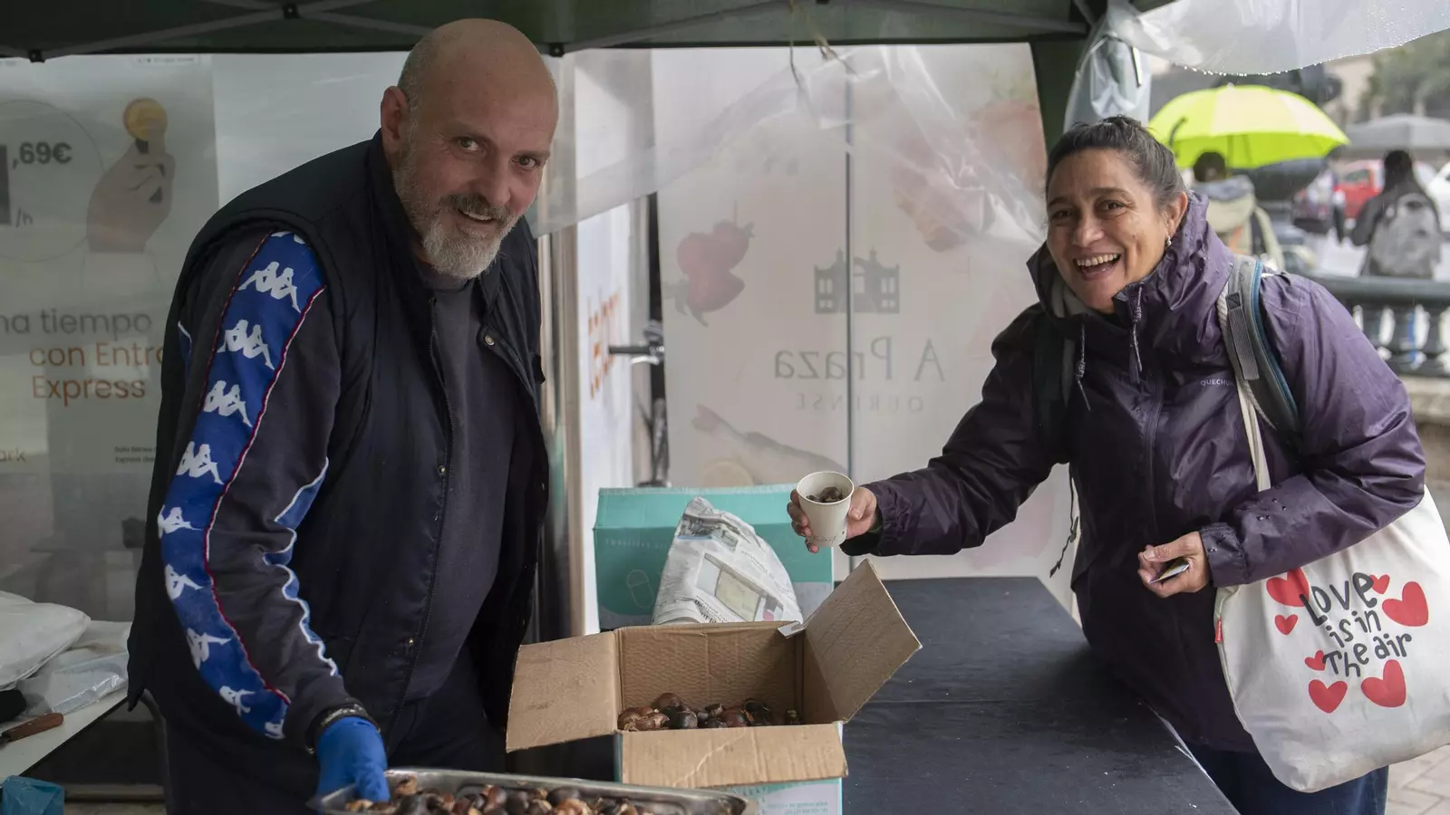 Desde primera hora de la mañana, se abrió una parrilla frente a la instalación temporal de la Alameda, donde los frutos se fueron asando a fuego lento, y atrayendo la atención de los curiosos. Fueron primero los clientes habituales los que se fueron con su cucurucho en el bolsillo, para dar paso más adelante a quienes llegaron atraídos por el boca a boca o el adelanto que publicaron en sus redes sociales.