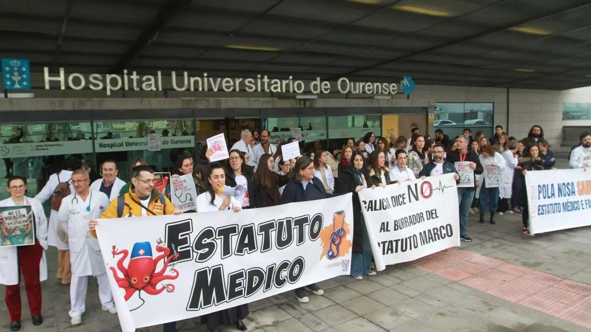 La primera jornada de la huelga de médicos contra el Estatuto Marco destacó por la disparidad de cifras, la tensión en torno a los servicios mínimos y la percepción, dentro de los hospitales, de un seguimiento muy elevado del paro. Mientras el Sergas ofreció datos oficiales que sitúan la incidencia global muy por debajo de las estimaciones sindicales otras voces hablan de una jornada con una afección notable, especialmente en el ámbito hospitalario. En Ourense, los médicos se manifestaron ayer a las puertas del CHUO.