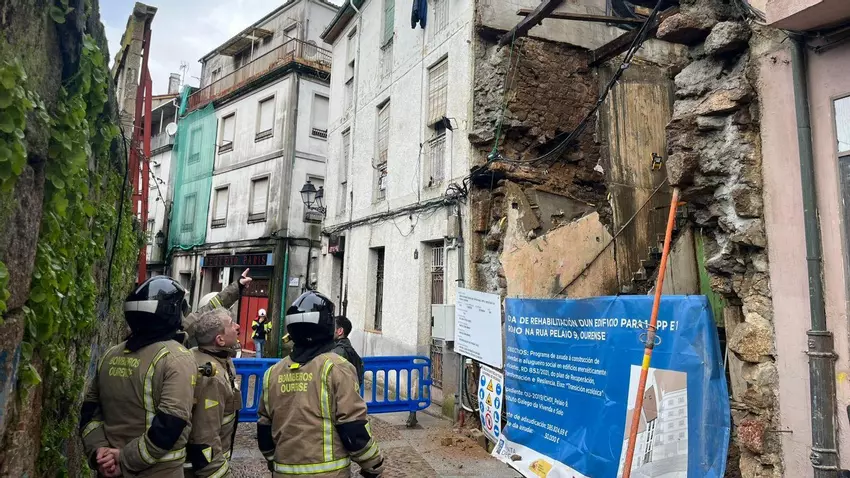 Un edificio del Casco Vello de Ourense ha sufrido el derrumbe de una de sus paredes laterales esta mañana de lunes. Sucedió en una jornada en la que el tren de borrascas volvió a dejar fuertes lluvias en la ciudad, afectando de este modo al inmueble.