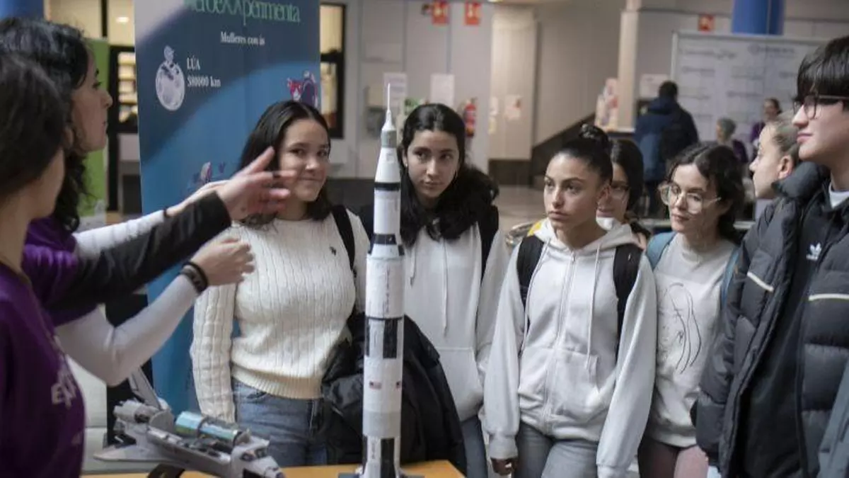 María Valcárcel, estudiante de tercer curso de Ingeniería Aeroespacial, junto a dos compañeras, presentaba maquetas como “la del Saturno V o la del Discovery, que fue el transbordador espacial que llevó el Hubble”. A su lado, un túnel de viento acaparaba la atención de los presentes. Se abrían puertas, los visitantes pasaban de un salón a otro… La capacidad de la ciencia, en especial hecha por mujeres, continúa generando interés.