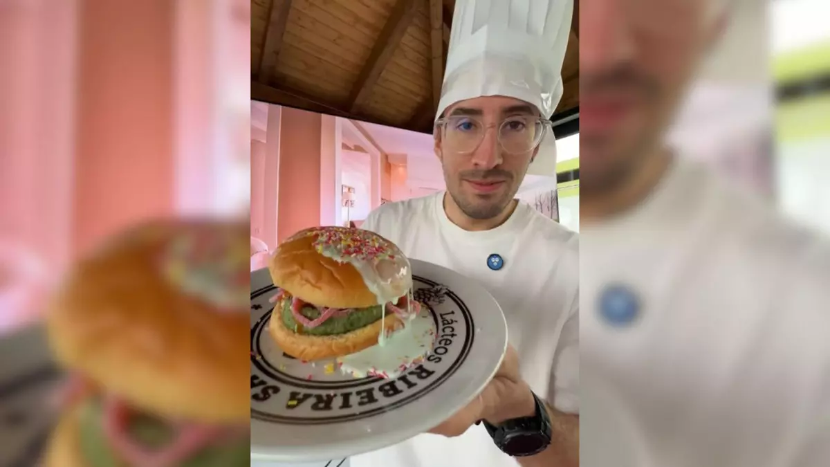 El streamer y creador de contenido @deeibis ha publicado un vídeo en el que muestra la que, supuestamente, sería su propuesta para un concurso de hamburguesas. El resultado: una hamburguesa verde coronada con gominolas, “delicias de mar” (sucedáneo de angulas o surimi), bebida isotónica espesada con maizena a modo de salsa y pepitas de colores esparcidas sobre el pan.