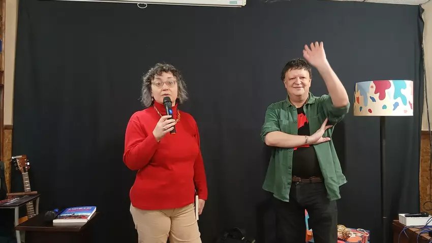 Xurxo toma un micrófono y agradece a Celia por la bienvenida y las palabras de elogio. El exmiembro de “Os Diplomáticos de Monte-Alto” intenta hablar a viva voz, pero el reclamo de los asistentes en el fondo de la sala lo hace volver a tomar el micrófono e iniciar con ello una liturgia con aires de rock para convertir la presentación del libro en un concierto. El espacio en pocos minutos se transformará en cruce de recuerdos, canciones, ritmos y coros impulsados por Xurxo.