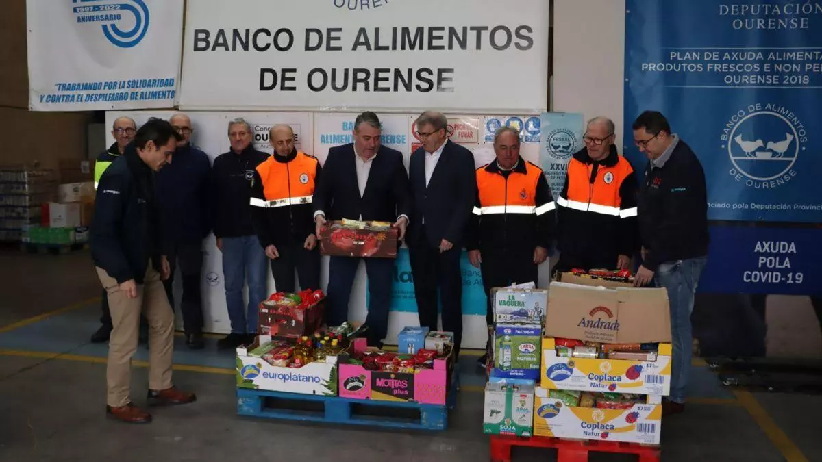 A rede de voluntariado de Protección Civil da provincia de Ourense fixo efectiva a entrega de alimentos non perecedoiros ao Banco de Alimentos. O acto tivo lugar no almacén que a entidade benéfica xestiona no polígono de San Cibrao das Viñas, coa presenza do delegado territorial da Xunta, Manuel Pardo, que acompañou a entrega do material recollido a través do servizo provincial de Emerxencias. A iniciativa, desenvolvida baixo o lema “Por un Nadal feliz para todos”, mobilizou a un total de 37 Agrupacións de Voluntarios de Protección Civil da provincia. Para a recolección, os voluntarios habilitaron puntos de entrega en edificios públicos como consistorios, centros de saúde e colexios, así como en supermercados e áreas comerciais.