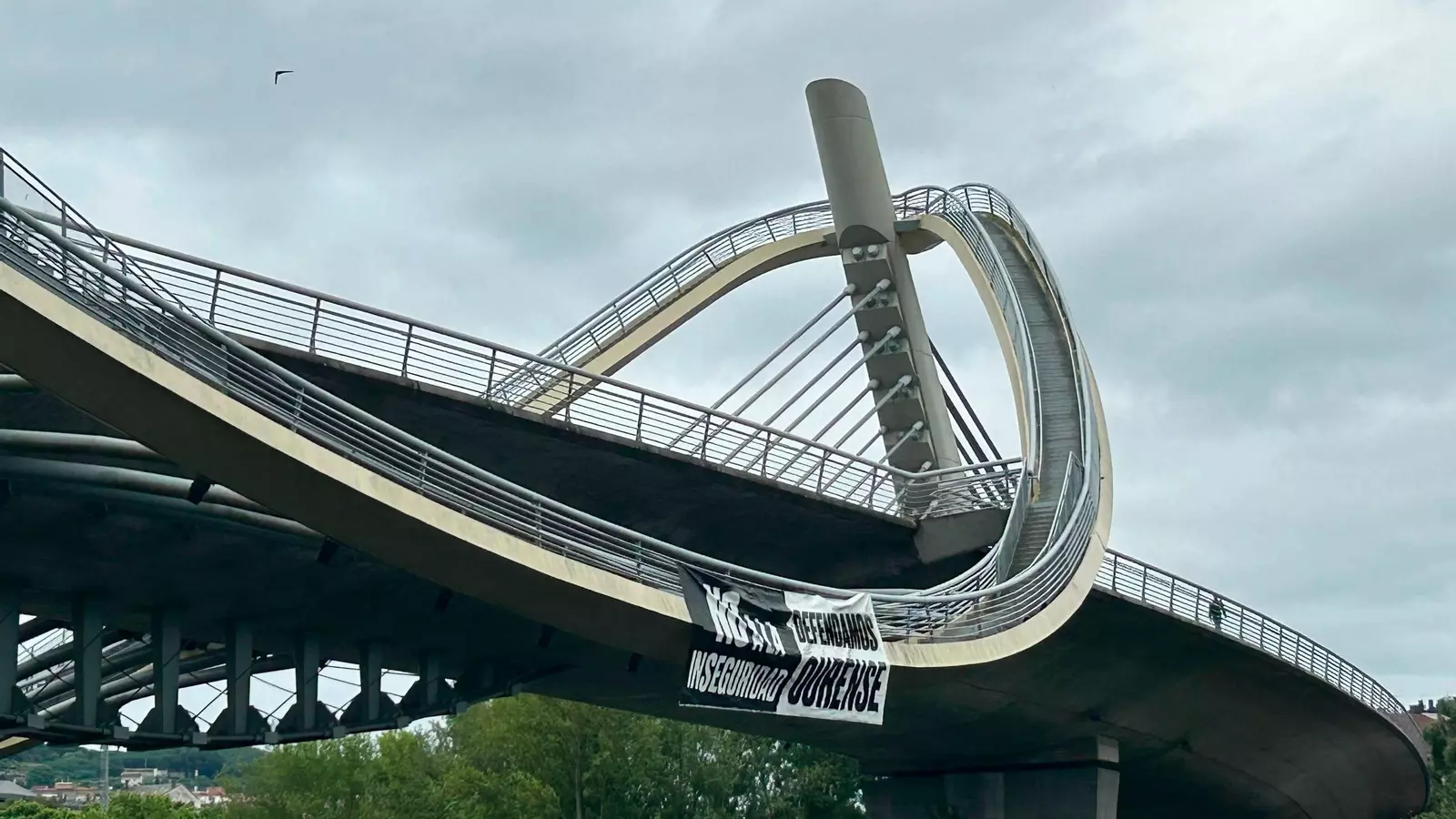 Una gran pancarta en la que se podía leer "No a la inseguridad" y "Defendamos Ourense" apareció este martes colgada de la escalinata del puente del Milenio. El cartel fue retirado a media mañana.