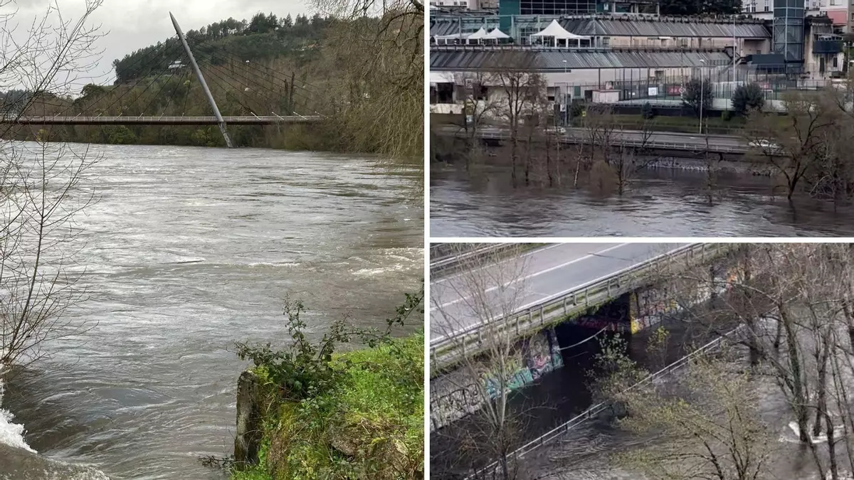 El río Miño sigue creciendo. Durante todo este jueves, las fuertes lluvias acaecidas en la ciudad de Ourense elevan el nivel del mismo hasta sobrepasar el umbral naranja. Así, por primera vez desde que arrancó el temporal que inunda diferentes puntos de la provincia, el Miño a su paso por Ourense superó los 7 metros de altura.