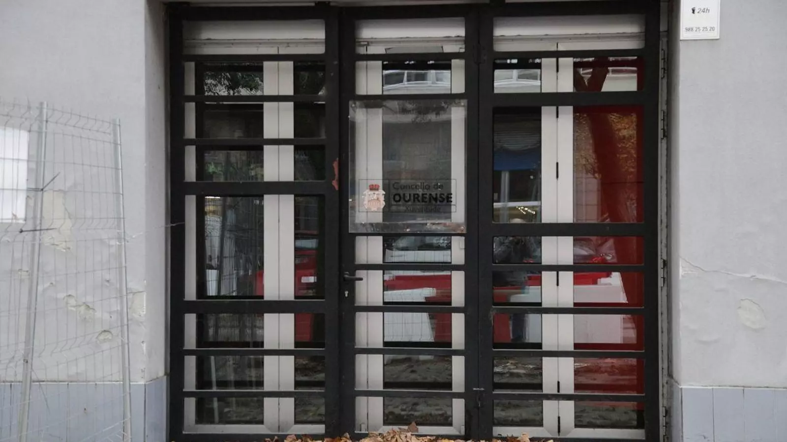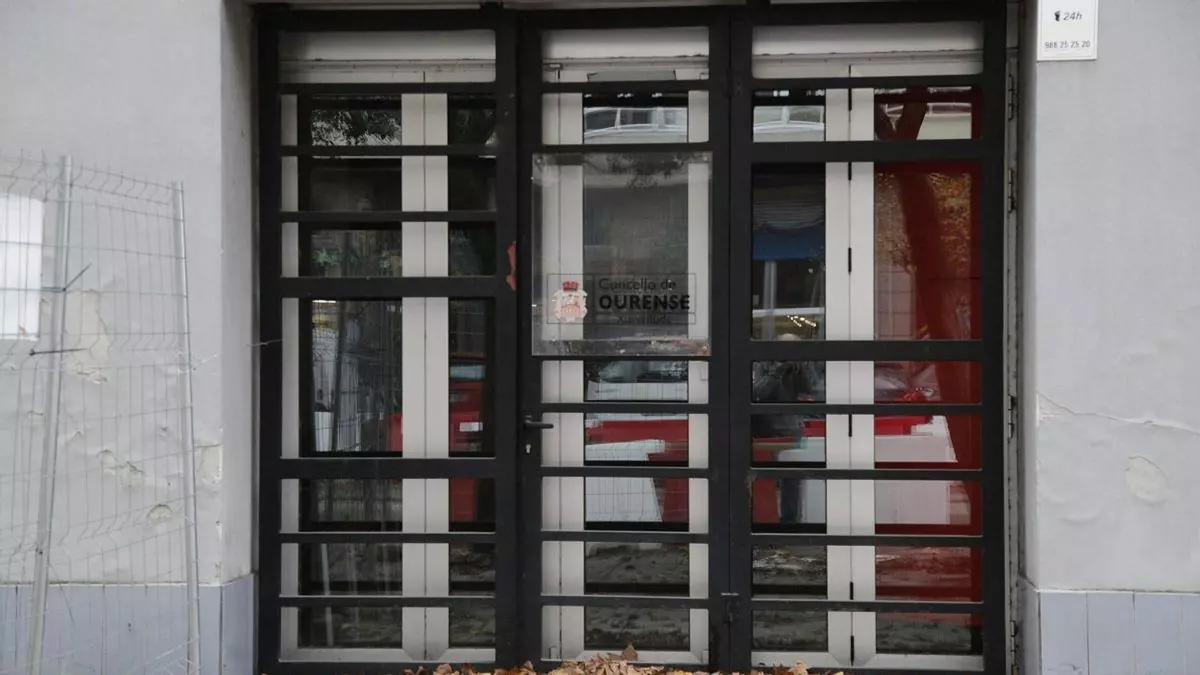 En el edificio de la avenida de Marín no hay rastro de modernidad ni de obra. La única realidad visible es el deterioro, la pintura desconchada en la fachada, carteles de programación de 2018 aún pegados en las ventanas y una alfombra de hojas secas acumulándose tras las vallas metálicas que bloquean la entrada, testigos mudos de la desidia.