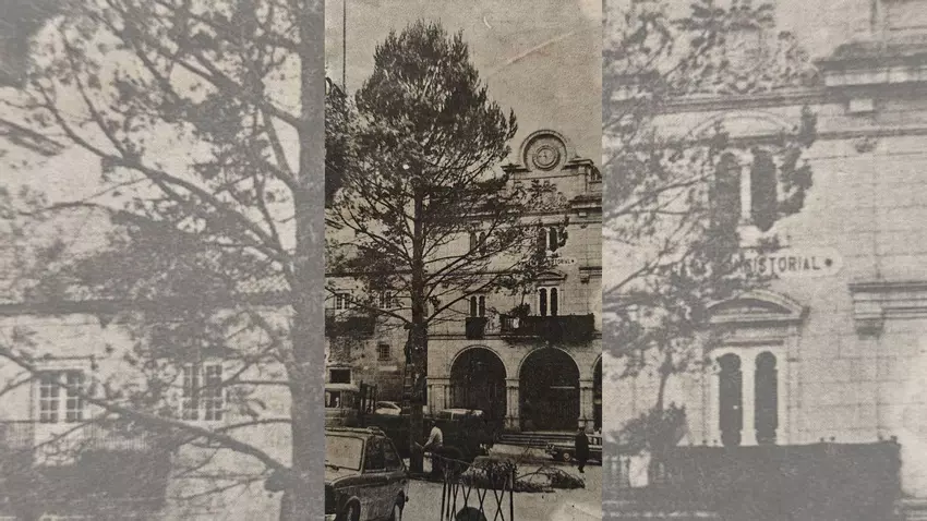 (2) Un pino de tamaño considerable ha sido “plantado” en la mañana de ayer en la Plaza Mayor, para presidir las próximas fiestas de Navidad y Reyes. Se trata de un ejemplar llegado de los bosques de Entrimo que, tras las operaciones de limpieza, ha quedado en disposición de que se inicien las labores de adorno e iluminación.