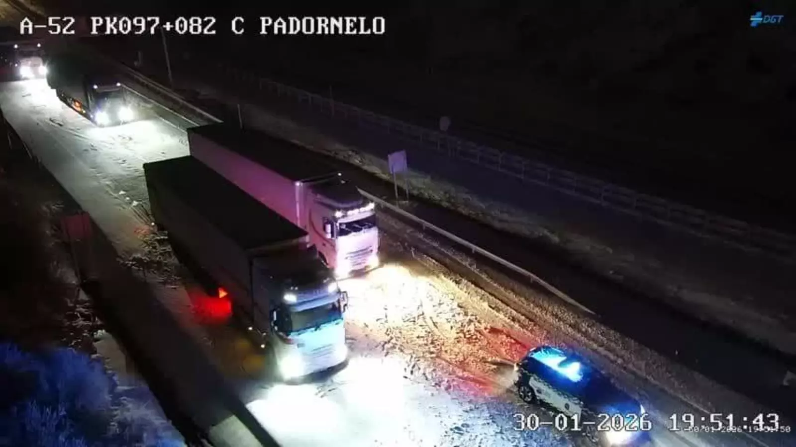 La A-52 registra importantes incidencias por nevadas a la altura de Robleda-Cervantes y A Mezquita, entre los kilómetros 79 y 112. La Guardia Civil ha cortado el tráfico en Padornelo, mientras que se reportan vehículos atrapados en el km 97, a la altura de Requejo, y embolsamiento de camiones en el km 143, en Riós. Esta zona está marcada con aviso negro en la información que reporta la Dirección General de Tráfico, situación intransitable de la autovía.