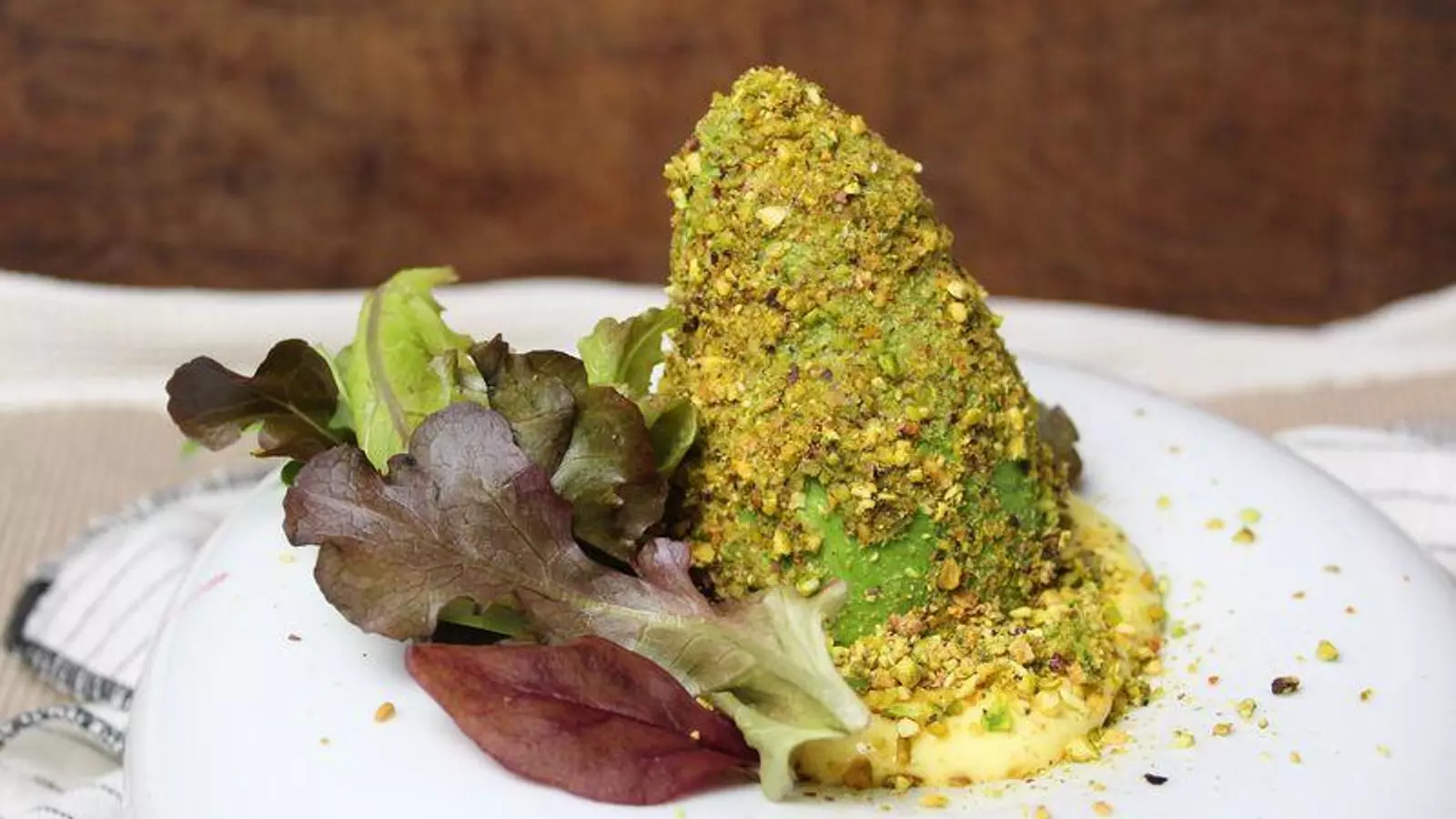 Ahora, con la misma cuchara, y metiéndola entre la carne y la piel, intentamos quitársela para que cada mitad nos quede limpia. Rellenamos los huecos de cada pareja de mitades y las juntamos para darle forma de aguacate entero. Solo nos queda rebozar en un bol con cuidado, y cubriendo toda su parte exterior, con los pistachos triturados.