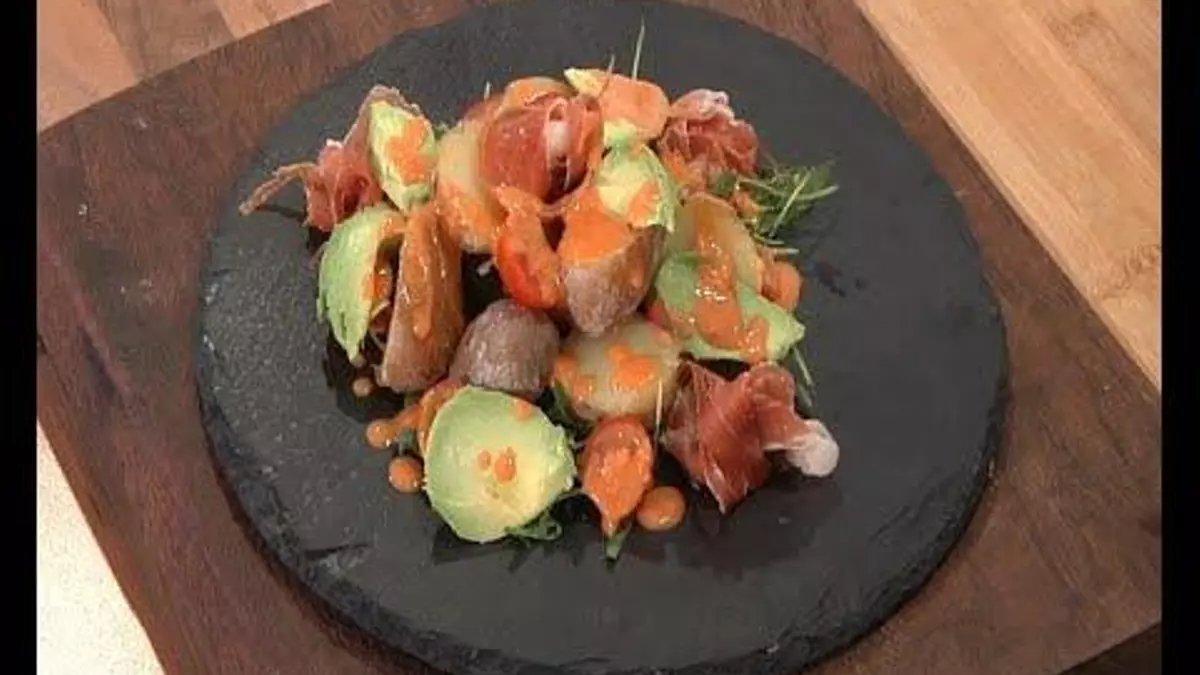 Plato muy especial por la fusión de sabores y muy nutritivo por la variedad de ingredientes. Será equilibrado si respetamos unas adecuadas proporciones dándole protagonismo a la rúcula, los tomates cherry y el aguacate (grasa de gran calidad). Los hidratos de un puñado de patatas (si las haces el día anterior y las dejas en la nevera serán un buen prebiótico que alimentará a tu microbiota intestinal) y el jamón como fuente de proteína junto a las almendras (que también son una buena fuente de calcio).