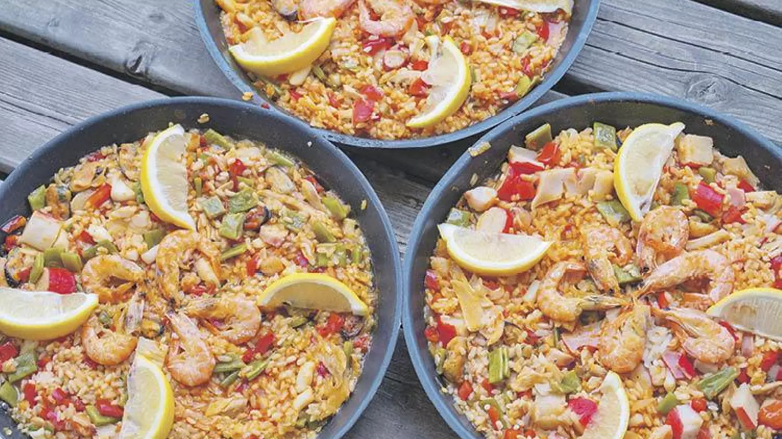 Ahora, en una cazuela baja y grande (o wok), doramos en una cucharada de AOVE los cuerpos de los langostinos. Los retiramos a un plato y en el mismo recipiente doramos el puerro picado. Añadimos el pimiento bien picado y la salsa de tomate. Cocinamos a fuego medio durante 5 minutos antes de añadir el arroz. Removemos hasta que se impregne de los colores y sabores, y añadimos 600-700 ml de caldo. Cuando coja temperatura, añadimos las almejas, la merluza troceada, las judías y los langostinos. Removemos, integramos ingredientes y fuego fuerte durante 4-5 min. bajamos a fuego medio 10 minutos más y apagamos. Dejamos reposar (tapado con un trapo) antes de servir.