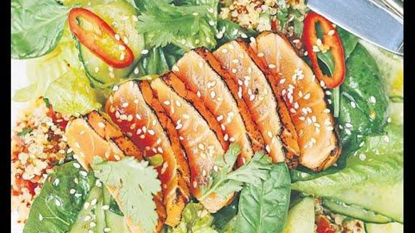 Al cabo de esos 15 minutos, sacamos el atún de la marinada y lo escurrimos bien. Lo marcamos en una sartén con una cucharada de AOVE por los cuatro lados, dejando crudo el interior del rectángulo. Lo sacamos a un plato en donde lo rebozamos con las semillas de sésamo. Cortamos en dados de 2-3 centímetros y presentamos en una fuente encima del salteado de hortalizas y acompañando toda la receta con unos montoncitos de germinados.