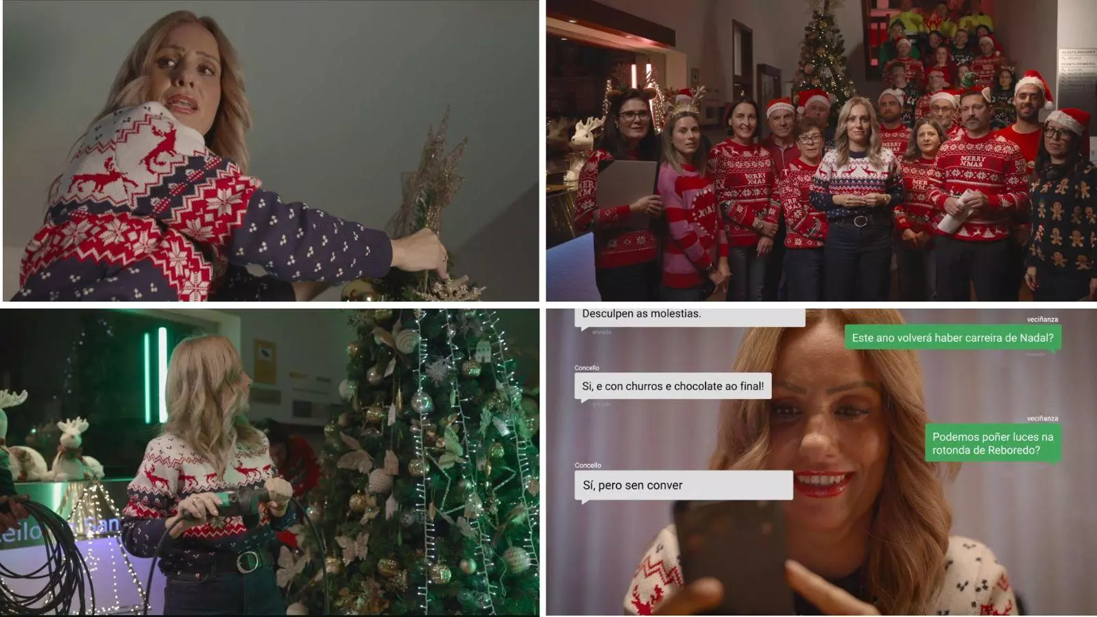 La pieza audiovisual muestra, desde el inicio, los preparativos previos a la grabación oficial del mensaje institucional. En el vídeo se ve a la alcaldesa maquillándose, colocando el árbol de Navidad e intentando poner la estrella en lo alto, en una escena en la que no faltan comentarios cómplices del equipo: “Marta, un pouco máis a esquerda”, se escucha fuera de plano, a lo que ella responde con ironía: “Para esquerda non, muller, xa esto parece o belén de Vigo”.