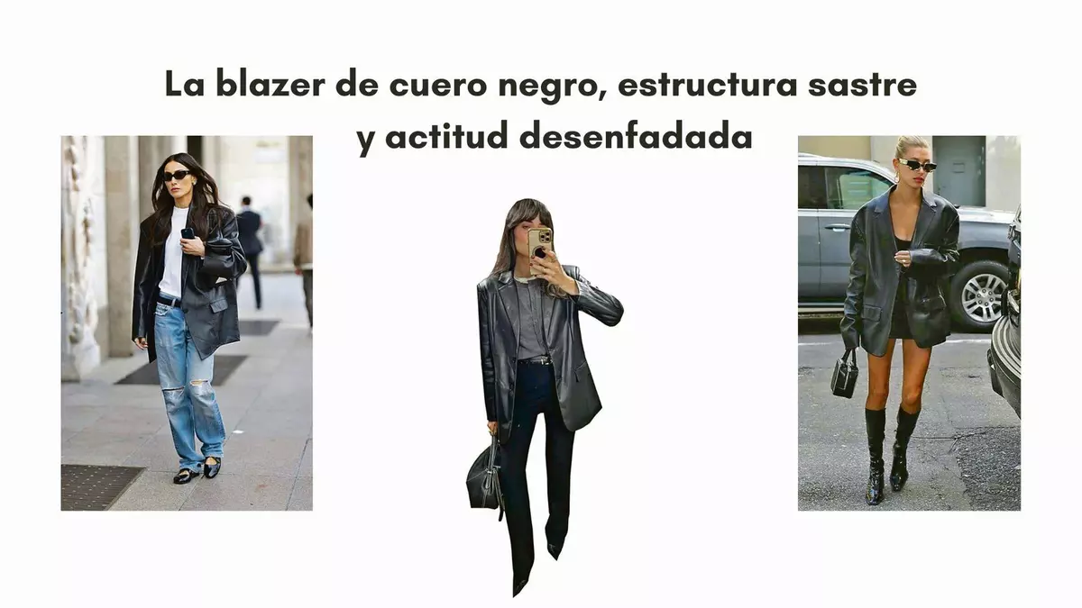 Para las mañanas en la oficina o videollamadas importantes, apuesta por la mezcla clásica: blazer de cuero negro sobre una camisa blanca nítida y pantalones de traje fluidos. El contraste entre la formalidad de la sastrería y la textura del cuero crea un equilibrio impecable.