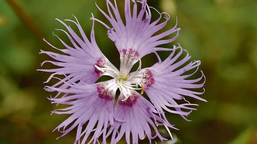 Sus raíces, aunque su parte aérea se seca en invierno, siguen vivas bajo tierra, rebrotando en la primavera siguiente. Sus tallos florales son largos, esbeltos y pueden ser ramosos o simples. Sus hojas, de color verde grisáceo, son opuestas, largas, delgadas y blandas. Sobre los tallos florales aparecen pequeños capullos que se abren en vistosas flores, solitarias y de suave y agradable fragancia, tienen los pétalos de color rosado o incluso blanco, a menudo con una mancha basal oscura, rematados con flecos muy profundos y característicos, que la hacen fácilmente reconocible. Estos flecos son conocidos en botánica con el nombre de “lacinias”. Florece durante el verano. Sus frutos son capsulares y albergan en su interior semillas pequeñas, irregulares y aladas. En Galicia se encuentra en todo el territorio, creciendo de modo natural, en pequeños grupos, en pastos, claros de bosques, matorrales e incluso dunas, grietas de rocas o acantilados de la zona costera. En general, se desarrolla en zonas soleadas, con terrenos pobres en nutrientes y bien drenados. Es una planta muy resistente a las sequías y a las heladas. Sus semillas pueden plantarse en jardines o macetas.