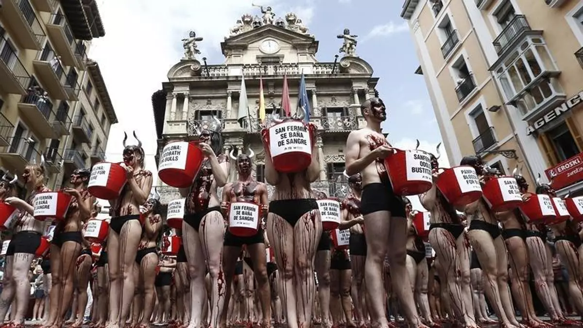 En torno al mediodía, justo a la misma hora en la que mañana se lanzará el chupinazo en ese lugar, los activistas se han tirado por encima sangre artificial, dejando una impactante imagen con la que han pretendido concienciar a los pamploneses "de toda la sangre inocente derramada por cada uno de los toros durante los días que duran las fiestas".
