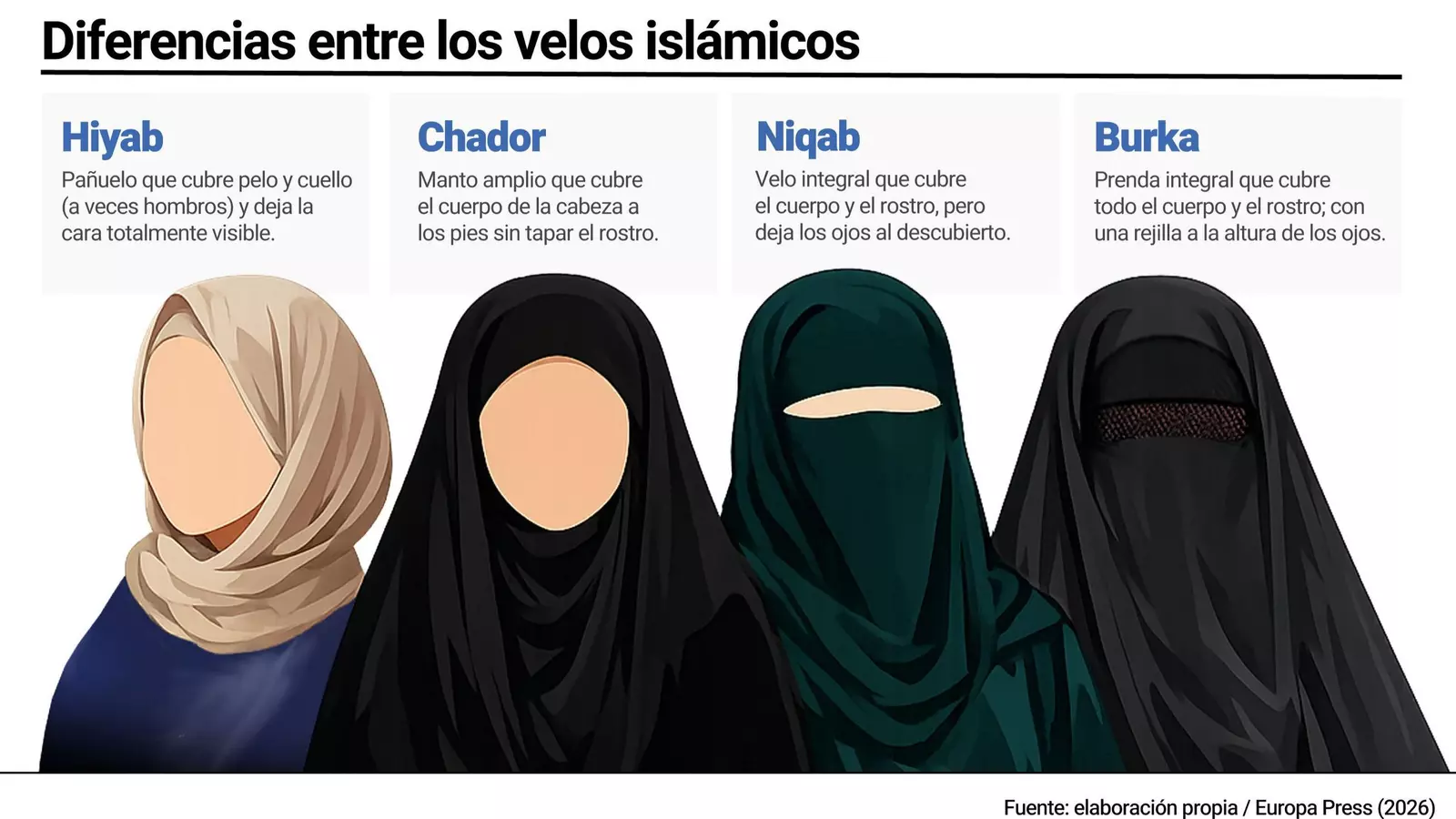Conoce las diferencias entre hiyab, chador, niqab y burka: qué cubre cada prenda, su origen y en qué países es más habitual su uso.