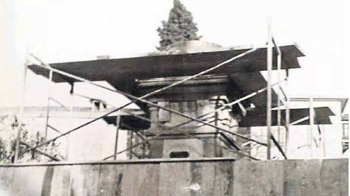 Eso que asoma por encima del vallado de madera, es el pedestal que el pintor Ramón Parada Justel diseñó para acoger a la gran Concepción Arenal. Cuentan las crónicas que en su construcción y colocación se contó también con la colaboración y consejo de Vázquez Gulias, como arquitecto municipal. Lo lamentable no es que no se recuerde su autoría, sino que cuando se decidió (en contra del deseo de los ourensanos con don Ramón Otero Pedrayo a la cabeza) el traslado de la estatua a su ubicación actual en la rotonda delante del Palacio de Justicia (viejo) por un desconocido motivo, el pedestal se cambió; muy probablemente la premura y desconcierto que marcó ese traslado fueran causa de un estropicio o de una irresponsable pérdida de ese elemento arquitectónico.