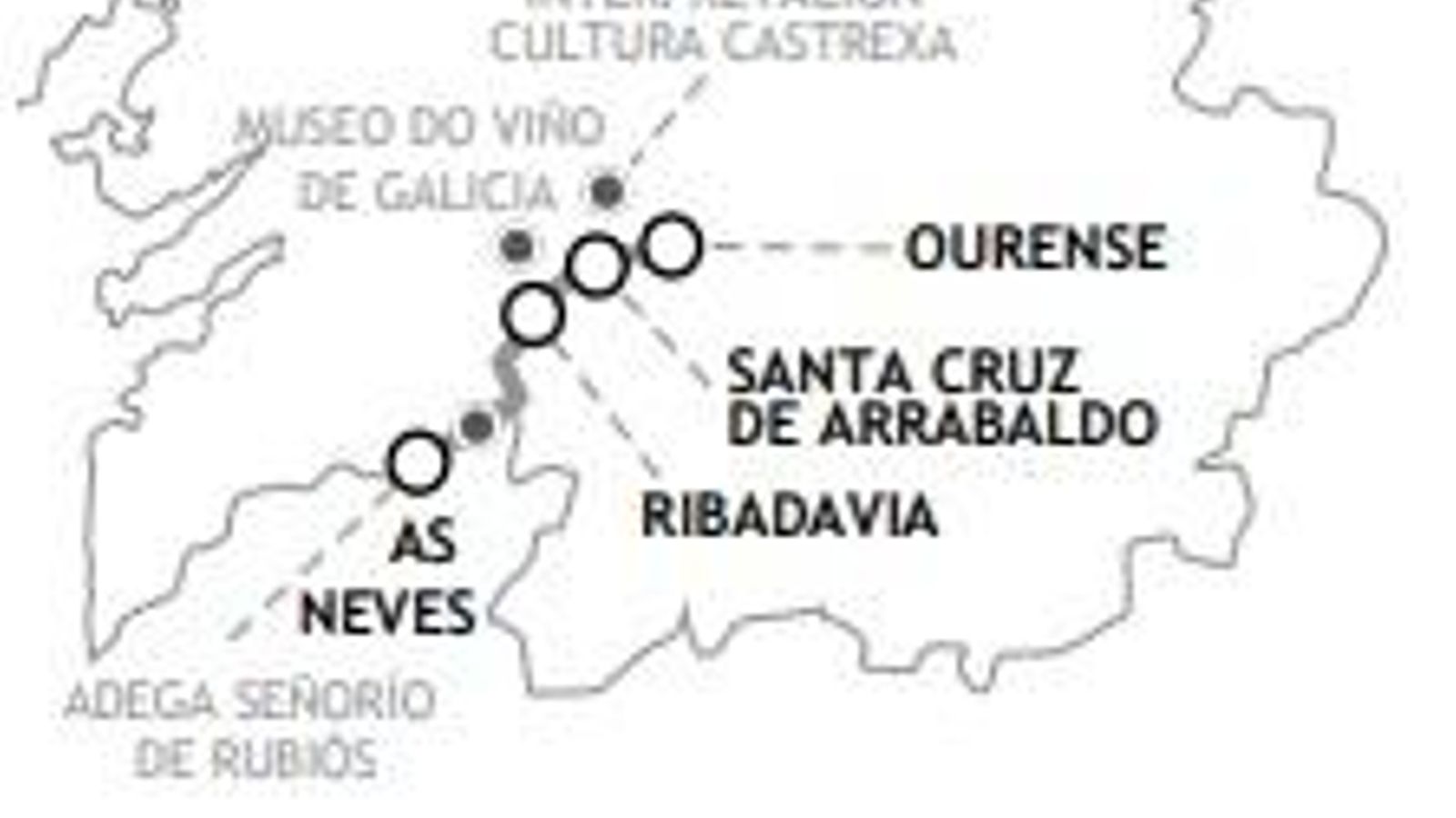 A lo largo del trayecto que conduce a Ribadavia y su castillo, se podrá degustar el vino de las bodegas Señorío de Rubiós. El Castillo de los Condes Sarmiento se asienta en una elevación del terreno a orillas del río Avia, en las proximidades de la confluencia entre el Avia y el Miño, perteneciente al término municipal de Ribadavia. Los orígenes del municipio se remontan al antiguo poblado prerromano que se situaba en el lugar donde hoy se emplaza la fortaleza, un punto estratégico para dominar parte de la comarca.
