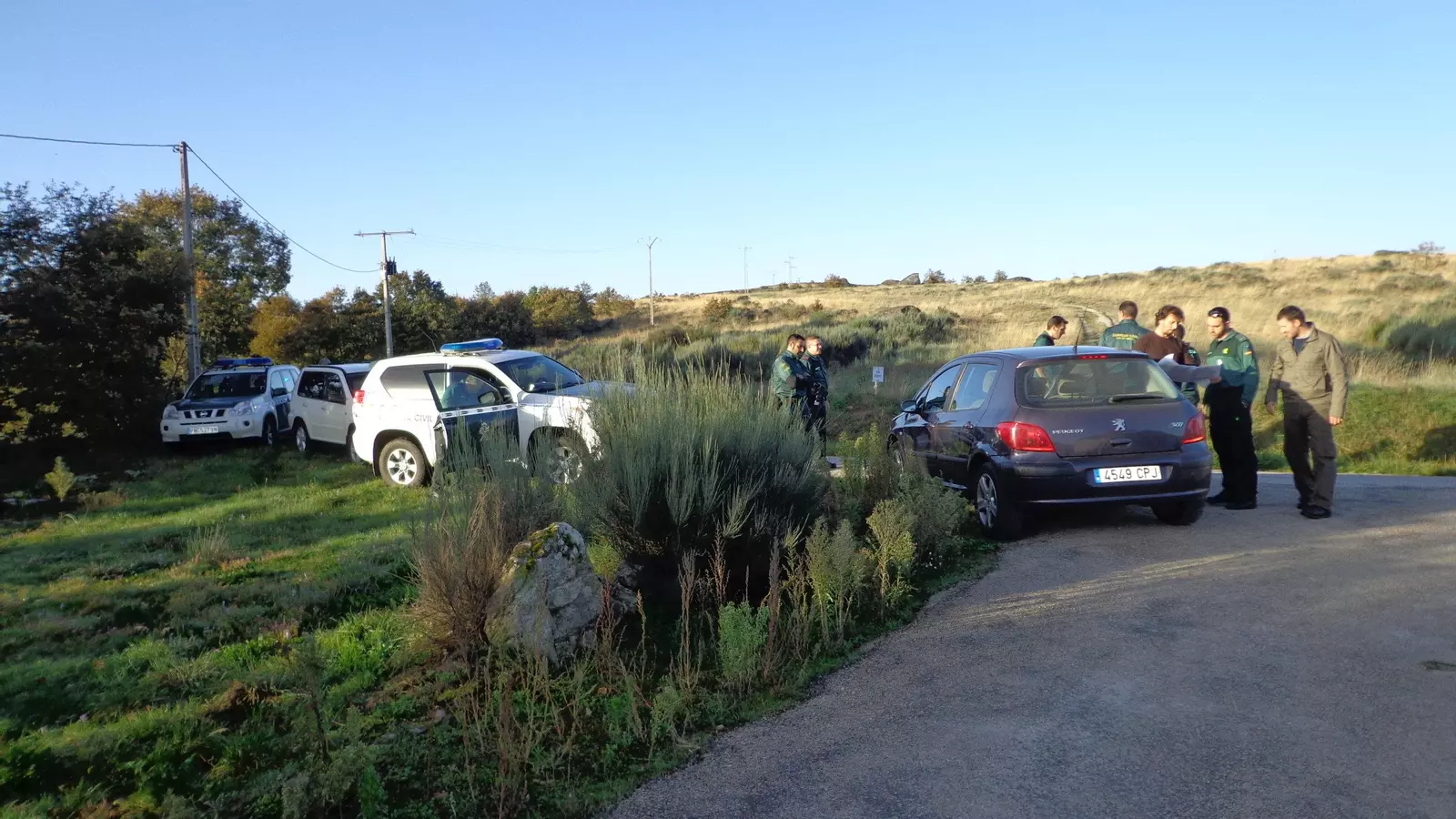 Agentes de la Guardia Civil rastrean con perros el lugar donde apareció el fragmento de un cráneo