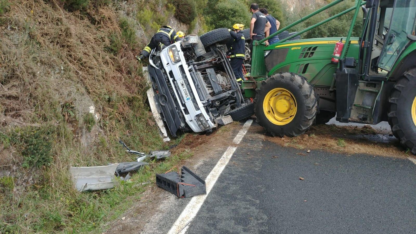 Hasta el lugar se movilizó un helicóptero medicalizado con base en Ourense, que se retiró ante la imposibilidad de evacuar al conductor. También se desplazaron efectivos sanitarios, que atendieron a la mujer e hija del fallecido, así como fuerzas de seguridad, bomberos y una grúa para intentar mover el vehículo articulado.