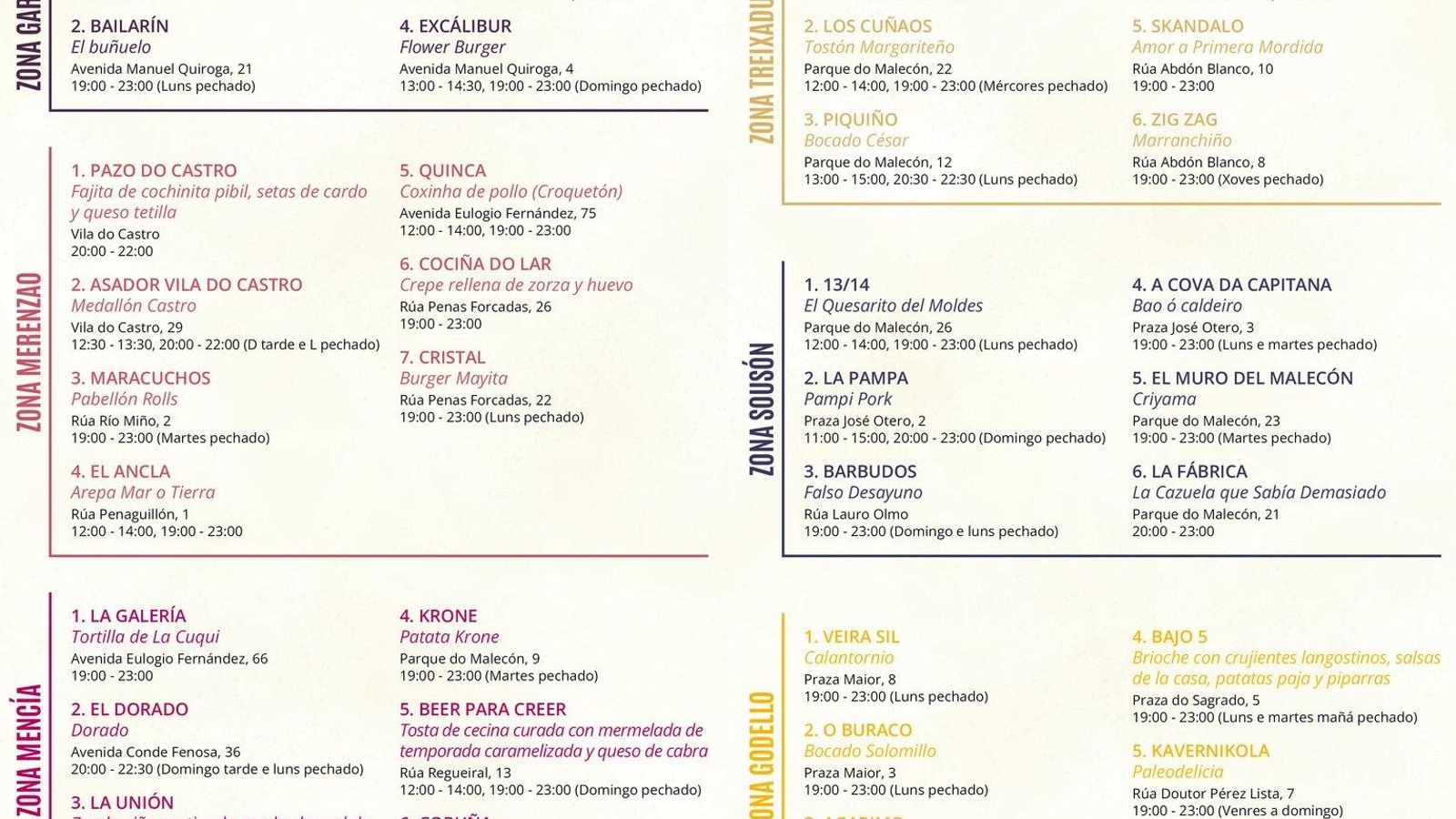 Los establecimientos fueron repartidos en seis zonas bautizadas con nombres de uvas valdeorresas: Garnacha, Merenzao, Mencía, Treixadura, Sousón y Godello. En los locales, los clientes encontrarán un boleto que deberán sellar en al menos uno de cada zona para valorar los pinchos, siendo su criterio el que decidirá los mejores. De esta forma, los votantes entrarán en el sorteo de cuatro cenas para dos personas en los restaurantes Pazo do Castro, Fernando III, Piquiño y Pulpería Dorado, gracias a la colaboración de Exclusivas Morales, Distribuciones Roca, Bodegas D’Berna y Distribuciones Anger.