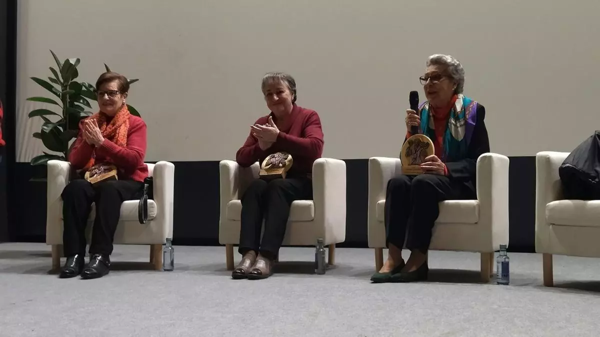 Carmen Gómez, Fina Álvarez y Toña Fernández, las tres homenajeadas, durante la gala.