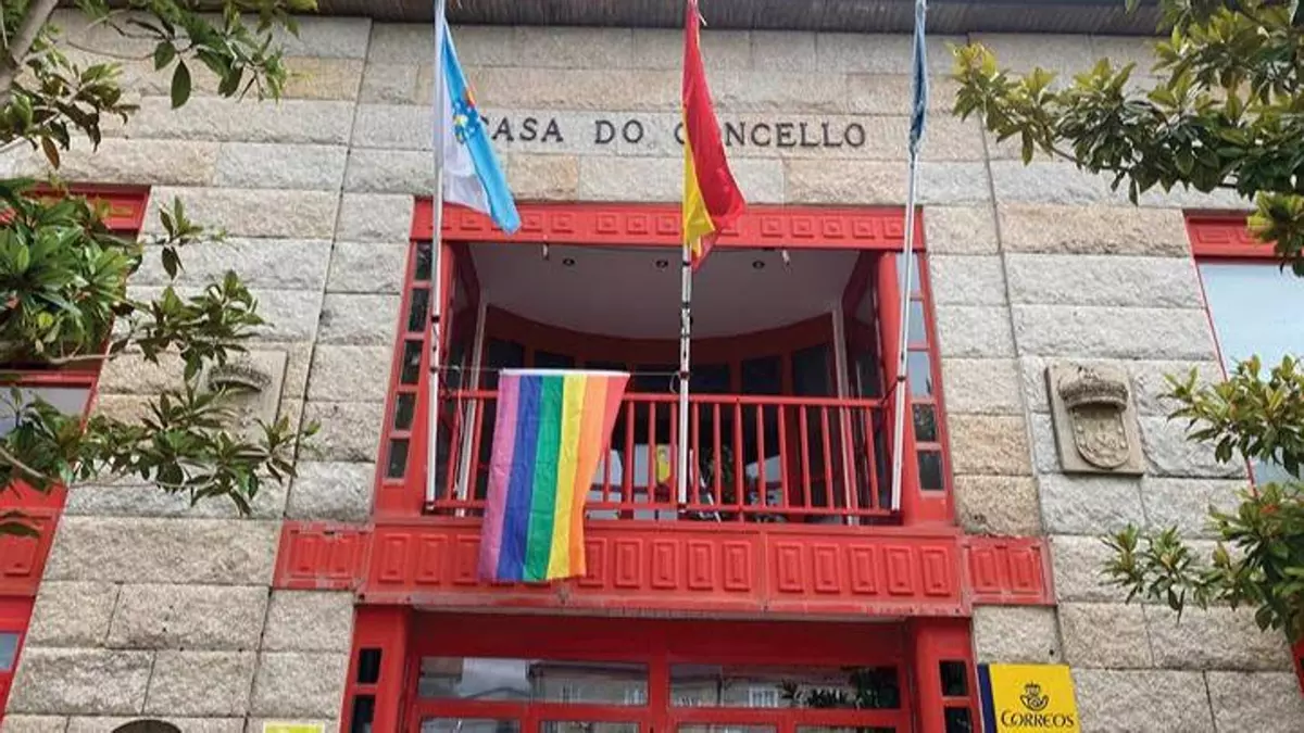El balcón de la Casa Consistorial de A Mezquita luce una nueva bandera, la LGTBI, con motivo de la conmemoración del 28 de junio, Día Internacional del Orgullo LGTBI.