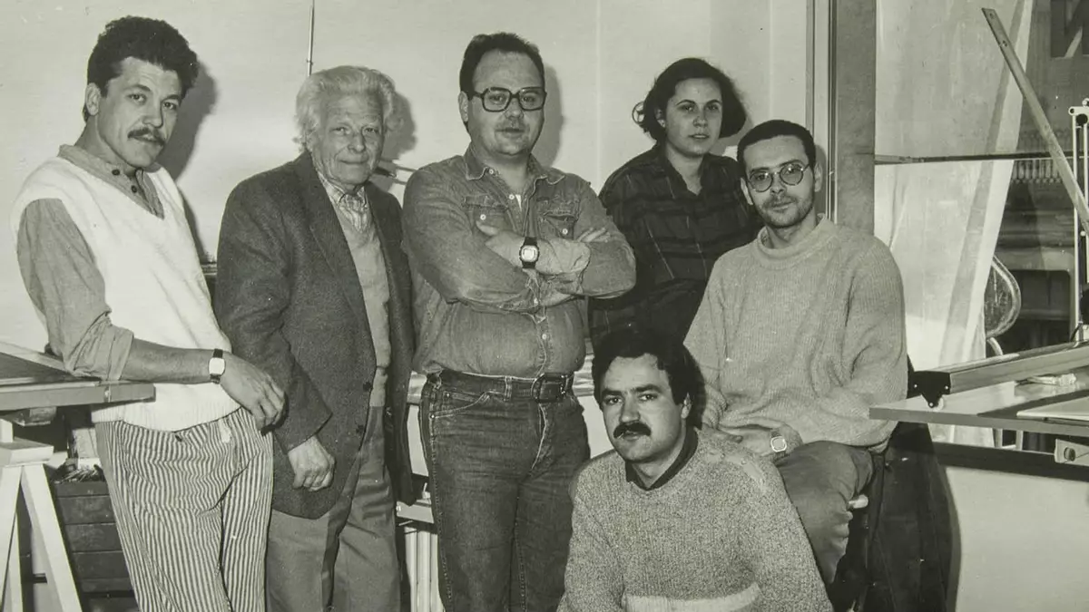 Santi Barreiros (fotógrafo), un amigo de visita, Luis Esperanza (organización y producción), Feli (departamento de contabilidad), Víctor González (dirección fotográfica) y, agachado, J. Luis Conde (laboratorio).