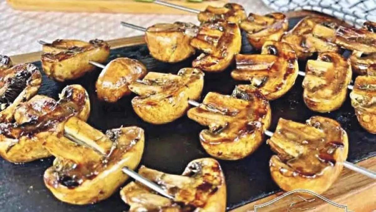 Dejamos macerar 20 minutos (removemos de vez en cuando ). Vamos pinchando en cada brocheta los champiñones.