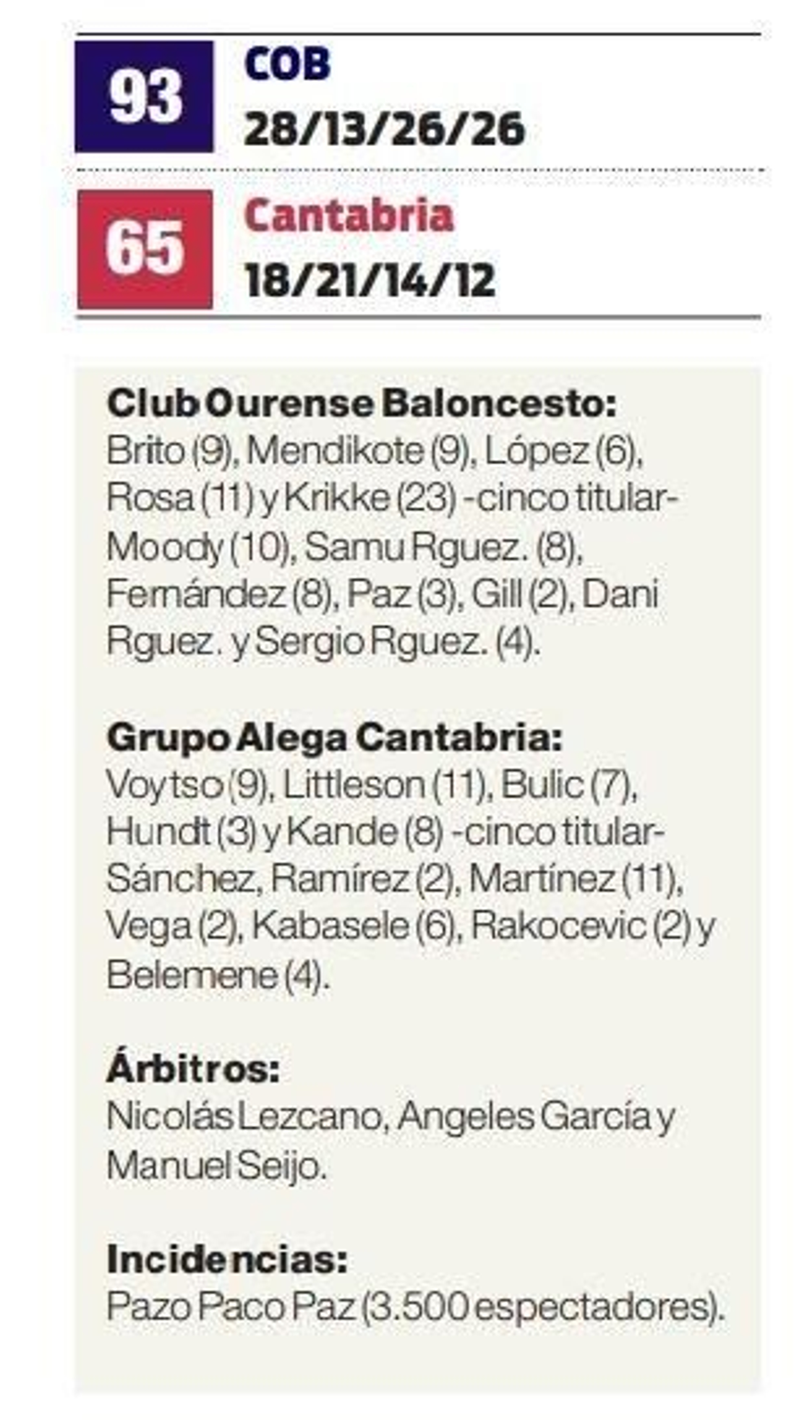 Fue en la segunda parte cuando el COB dio lo mejor de sí. Brito y Krikke enseñaron el camino y Moody lo asfaltó con tiros de todos los colores. Con 57-51 en el minuto 25, el técnico Moncho López dispuso un quinteto “bajito”, con Krikke, Mendikote y Sergio Rodríguez haciendo diabluras por la zona. Por fuera, incluso se atrevió con la dupla gallega del atrevido Martín Fernández y el discreto Santi Paz. El parcial de 20-6 no tuvo respuesta cántabra.