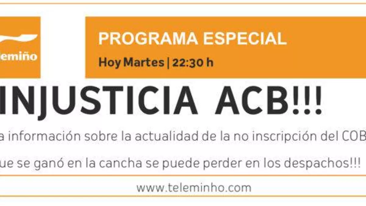 Este martes a partir de la 22,30 horas, Telemiño ofrece el programa especial de La Prórroga, ¡Injusticia ACB!, presentado por Jorge Ron. En el que analizará toda la información de actualidad de la no inscripción del COB en la liga de baloncesto ACB.