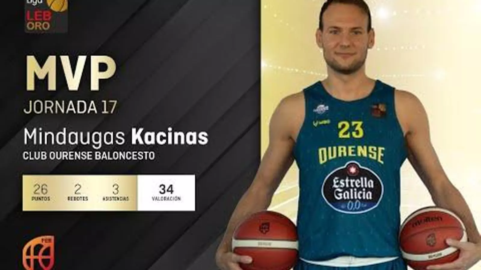 Un enfrentamiento con el que el club acabó la primera vuelta en puestos de play off. Todo un éxito del equipo, pero también de sus jugadores. Y es que tras el despliegue sobre el parquet del Pazo, el alero lituano Mindaugas Kacinas ha sido nombrado mejor jugador de la jornada en la LEB Oro. Se trata del primer MVP que consigue el COB en esta temporada, y desde hace tiempo.
